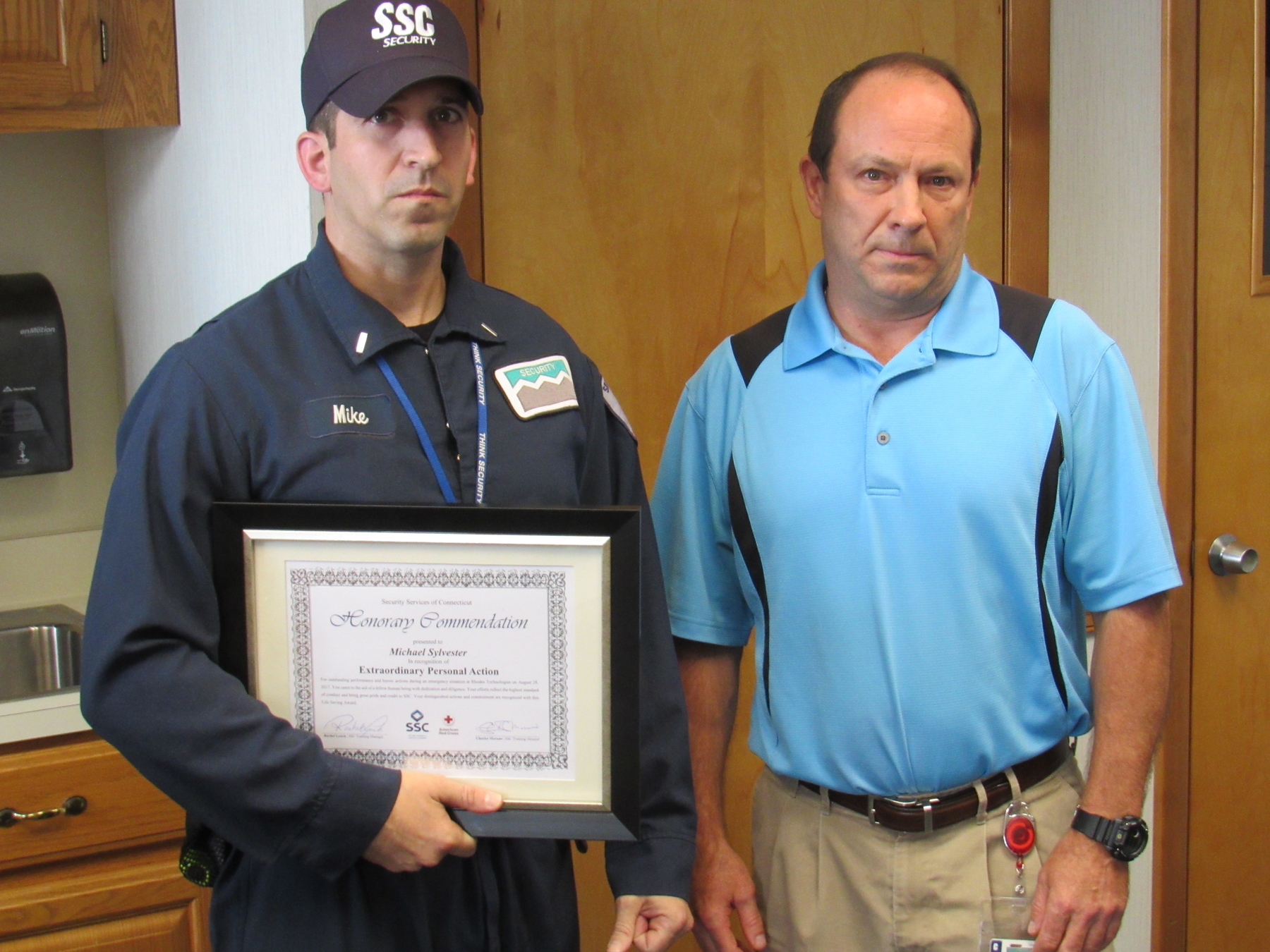 August 28, 2017 SSC security officer Michael Sylvester, assigned to a site in Rhode Island, put his life saving training into action when he responded to a medical emergency involving a person showing signs of distress, signaling they were choking. Michael’s swift, decisive and unwavering actions in performing abdominal thrust undoubtedly saved their life. Michael acted bravely and responsibly in accordance with his training and was commended by SSC President, Michael Burbage, for his outstanding effort and exemplary actions.